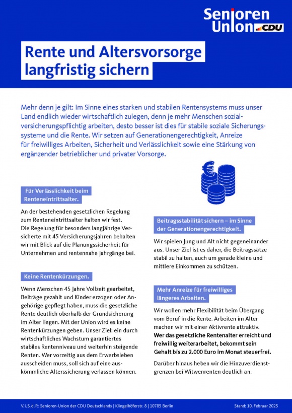 Die Senioren-Union hat bundesweit 56.000 Mitglieder. Mit ihren Gliederungen verfügt sie über eine flächendeckende Präsenz. Die SU vertritt lebensfroh und verantwortungsbewusst die Interessen der älteren Generation. Die christlich-demokratischen Senioren engagieren sich auf allen Ebenen auch und gerade mit den Jungen für eine gute Zukunft.